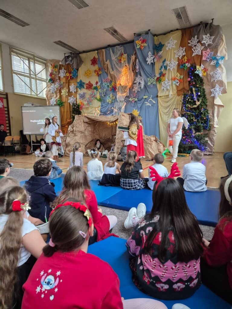 Uczniowie wraz z nauczycielami śpiewali kolędy, wprowadzając wszystkich w bożonarodzeniowy nastrój. 🎶 Nie zabrakło również słodkich poczęstunków,