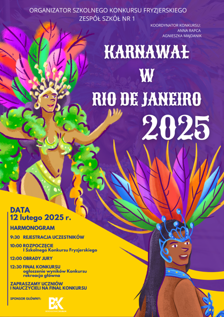 ZAPRASZAMY WSZYSTKICH NAUCZYCIELI 12 LUTEGO 2025 R. O GODZINIE 12:25 NA FINAŁ SZKOLNEGO KONKURSU FRYZJERSKIEGO
