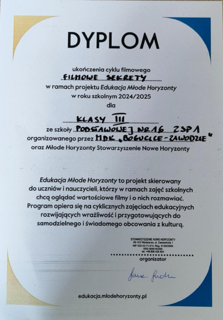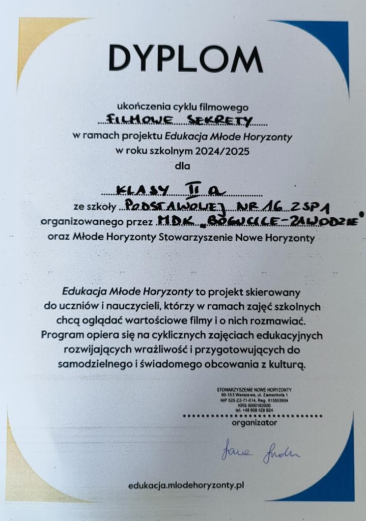 W okresie od października do kwietnia bieżącego roku szkolnego uczniowie klasy 2a i 3a SP16 raz w miesiącu uczestniczyli w edukacji filmowej Młode Horyzonty