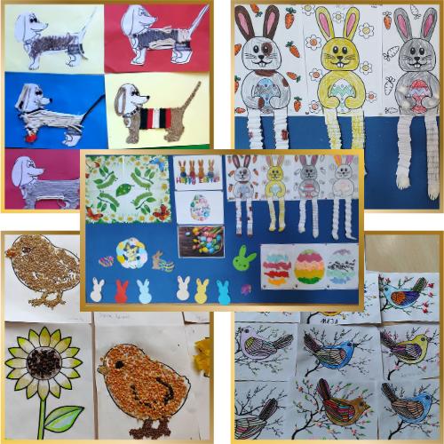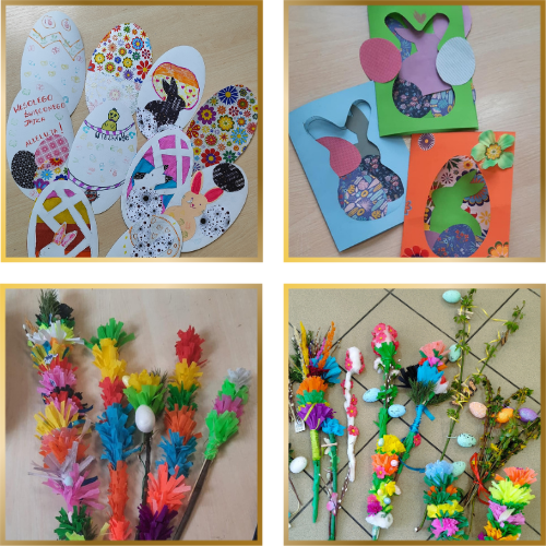w przygotowaniach do Świąt Wielkanocnych. Dzieci wykonywały kolorowe ozdoby – tworzyły pisanki, wielkanocne kartki, zajączki z papieru, dekoracje z bibuły