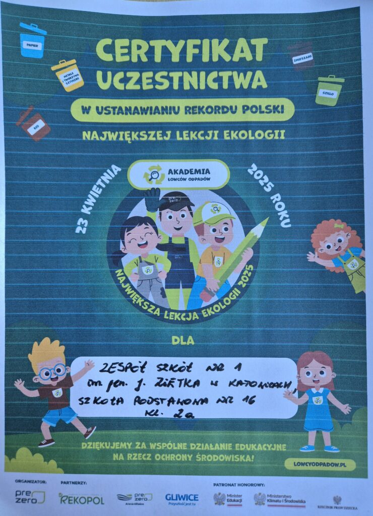 Z dumą informujemy, że nasza szkoła otrzymała certyfikat potwierdzający udział w ustanawianiu rekordu Polski w kategorii „Największa lekcja ekologii”