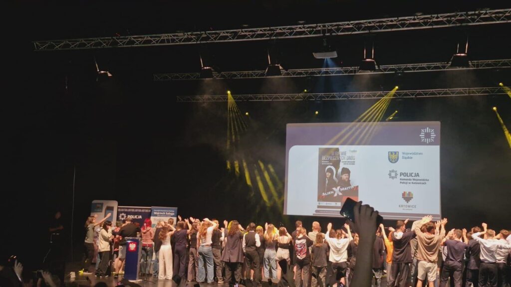 We wtorek, 3 czerwca br. uczniowie naszej szkoły uczestniczyli w wydarzeniu zorganizowanym przez Prezydenta Miasta Katowice, Wydział Ruchu Drogowego KWP oraz Urząd Marszałkowski Województwa Śląskiego, dotyczącym bezpieczeństwa w ruchu drogowym i odpowiedzialnego korzystania z Internetu – w szczególności w kontekście przeciwdziałania przemocy i hejtowi w sieci.