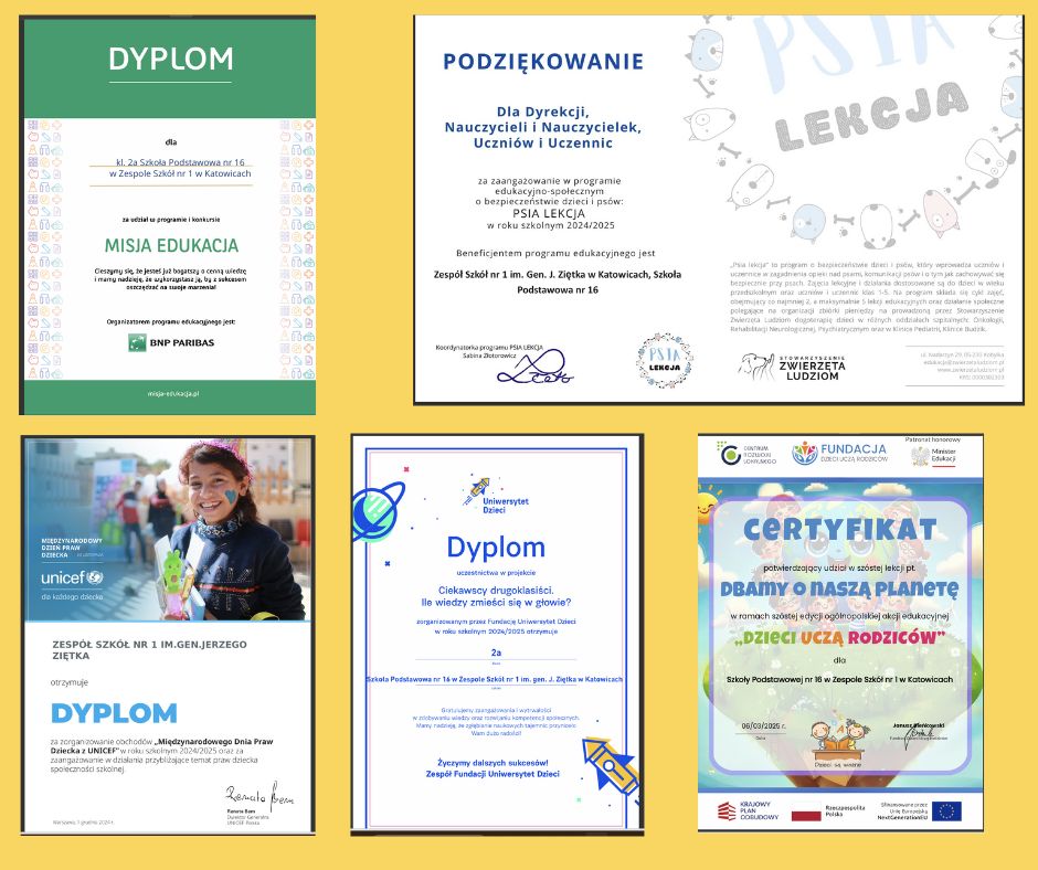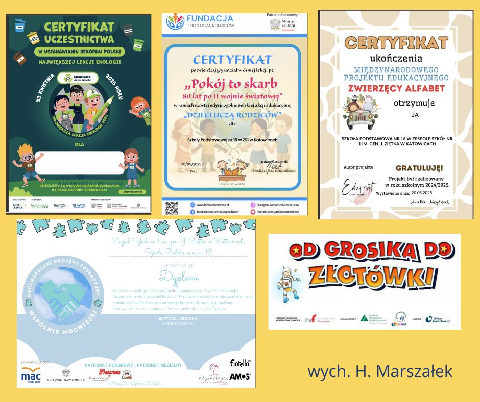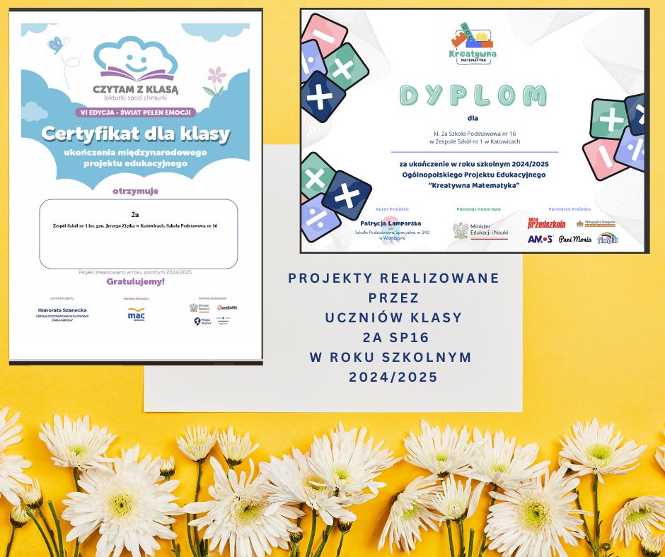 W roku szkolnym 2024/2025 pod nadzorem wychowawczyni Hanny Marszałek uczniowie z klasy 2a Szkoły Podstawowej nr 16 przy Zespole Szkół nr 1 im. gen. Jerzego Ziętka w Katowicach realizowała różnorodne projekty edukacyjne. Działania te miały na celu rozwijanie kompetencji uczniów, wspieranie ich kreatywności oraz budowanie zaangażowania we wspólnych przedsięwzięciach klasowych i szkolnych. Uczniowie aktywnie uczestniczyli w realizacji zadań, rozwijając umiejętności współpracy, odpowiedzialności i samodzielnego myślenia.