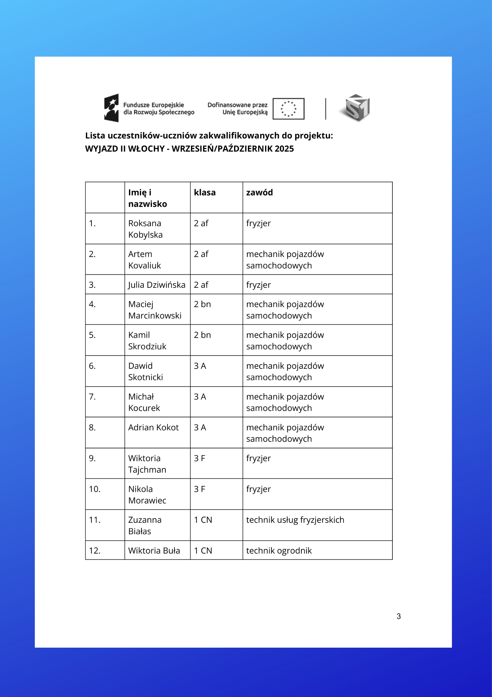 27 października 2025r. grupa 12 uczniów wraz z opiekunami wyrusza w podróż do Włoch, gdzie rozpoczną krótkoterminowe staże zawodowe w ramach projektu FERS.