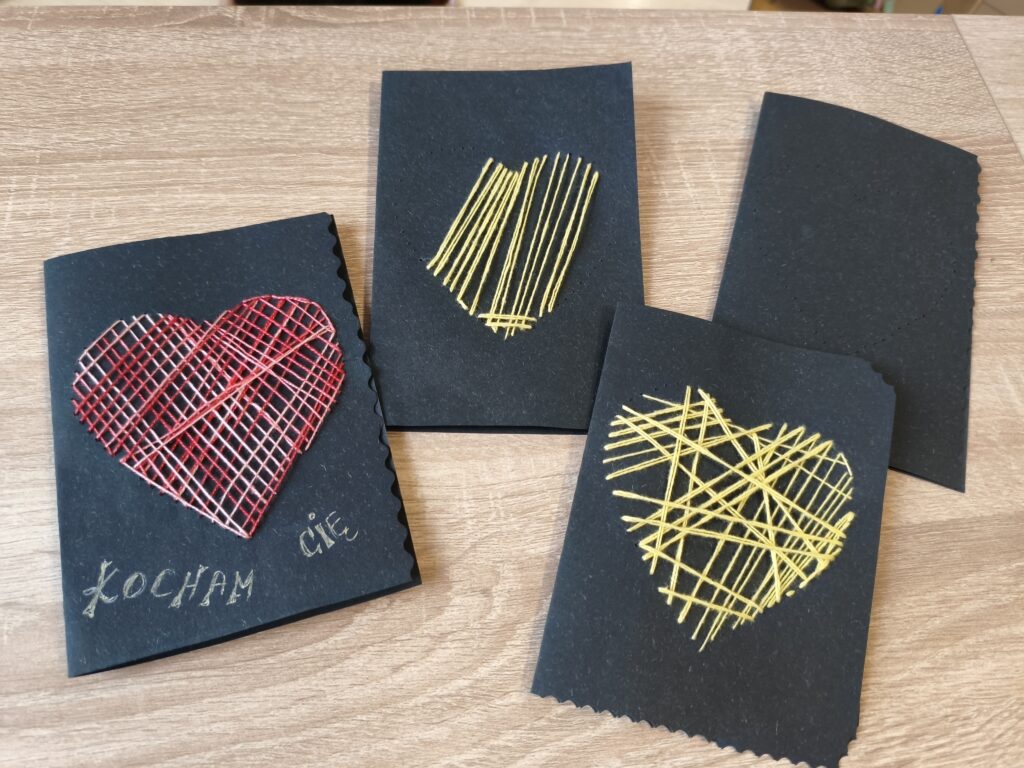 Nasze zajęcia udowodniły, że serce można przedstawić na tysiąc sposobów. Powstały prace inspirowane „kardiologią artystyczną”, kompozycje z kolorowej włóczki oraz kartki pełne ciepła i dobrych myśli. Każda z nich była inna — tak jak ich autorzy.