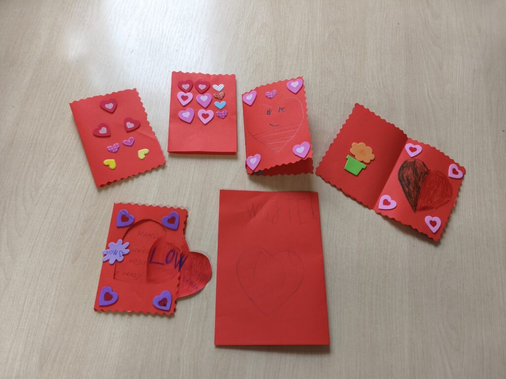 W ostatnich dniach szkolna świetlica zamieniła się w prawdziwą Manufakturę Dobrych Życzeń. Zamiast spokojnego odpoczynku wybraliśmy twórczy wir pracy, a motywami przewodnimi stały się czerwień, serca oraz nauka nowych, niezwykłych umiejętności.