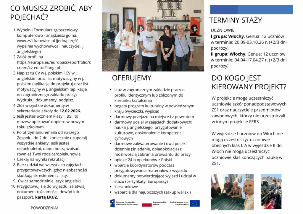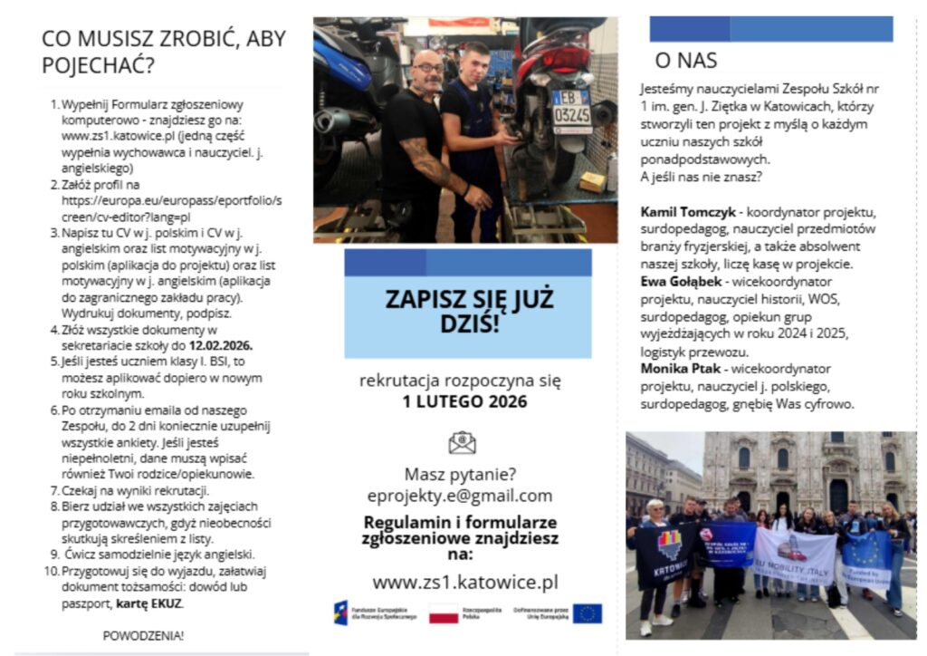 Zachęcamy wszystkich zainteresowanych uczniów do zapoznania się z regulaminem rekrutacji, który wkrótce będzie dostępny na stronie szkoły i udziału w projekcie. To doskonała okazja, by połączyć naukę zawodu z międzynarodowym doświadczeniem!